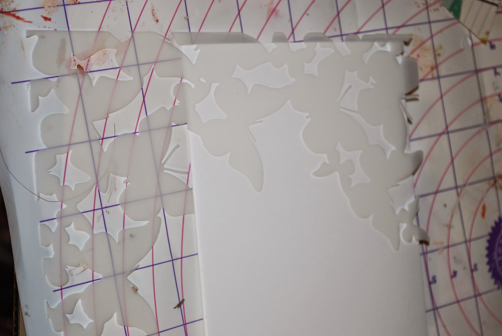 I started out by using the ARTplorations Shower of Flutters Stencil. This is actually a mask, not a stencil, which just means that it will leave the negative image instead of the positive image on the card.