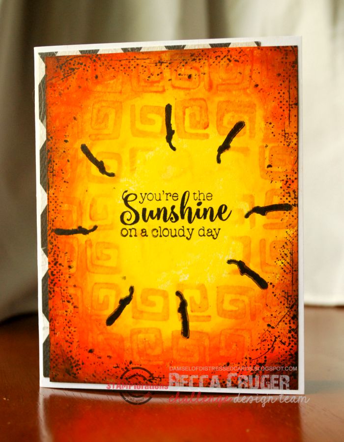 I really wanted the sentiment to be the focal piece and so I designed the entire card based on it. I made a super bright background using gelatos and then I sponged some Spiced Marmalade Distress Inks through the ARTplorations Tribal Swirls stencil. To make the "sun" even more apparent, I added some lines from the Artsy Border Maker set.